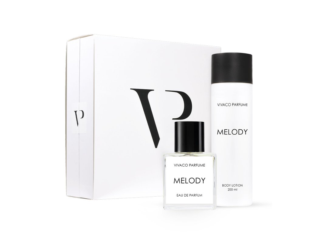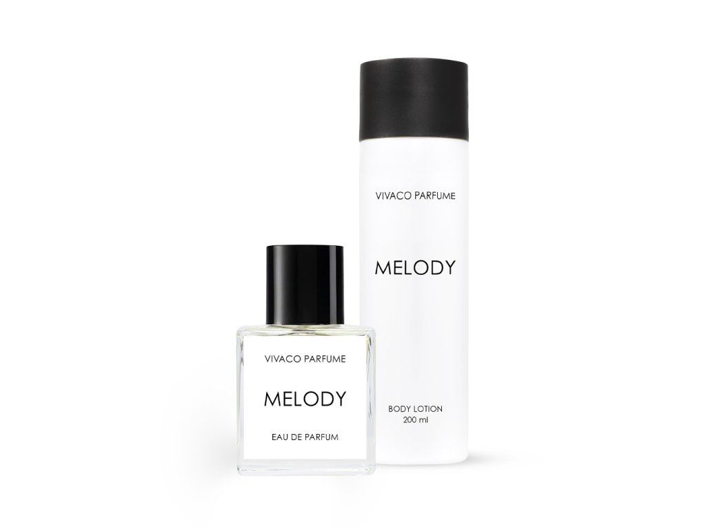 Parfém MELODY je ztělesněním sofistikovanosti a smyslnosti, které se spojují v dokonalé vůni, jež okouzlí a zanechá nezapomenutelný dojem, díky jemné kombinaci citrusových tónů bergamotu, květinového srdce bílého a pomerančového květu a smyslného základu dřeva, pižma a vanilky.